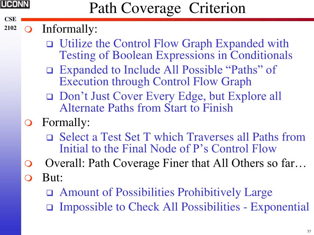 Path Coverage Criterion • Informally: • Utilize the Control Flow Graph Expanded with Testing of Boolean Expressions in Conditionals • Expanded to Include All Possible “Paths” of Execution through Control Flow Graph • Don’t Just Cover Every Edge, but Explore all Alternate Paths from Start to Finish • Formally: • Select a Test Set T which Traverses all Paths from Initial to the Final Node of P’s Control Flow • Overall: Path Coverage Finer that All Others so far… • But: • Amount of Possibilities Prohibitively Large • Impossible to Check All Possibilities - Exponential