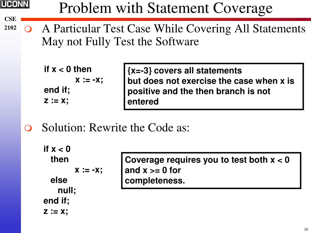 Problem with Statement Coverage • A Particular Test Case While Covering All Statements May not Fully Test the Software • Solution: Rewrite the Code as: if x < 0 then x := -x; end if; z := x; {x=-3} covers all statements but does not exercise the case when x is positive and the then branch is not entered if x < 0 then x := -x; else null; end if; z := x; Coverage requires you to test both x < 0 and x >= 0 for completeness.