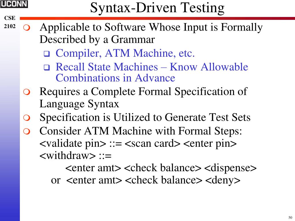 Syntax-Driven Testing • Applicable to Software Whose Input is Formally Described by a Grammar • Compiler, ATM Machine, etc. • Recall State Machines – Know Allowable Combinations in Advance • Requires a Complete Formal Specification of Language Syntax • Specification is Utilized to Generate Test Sets • Consider ATM Machine with Formal Steps:<validate pin> ::= <scan card> <enter pin><withdraw> ::= <enter amt> <check balance> <dispense> or <enter amt> <check balance> <deny>