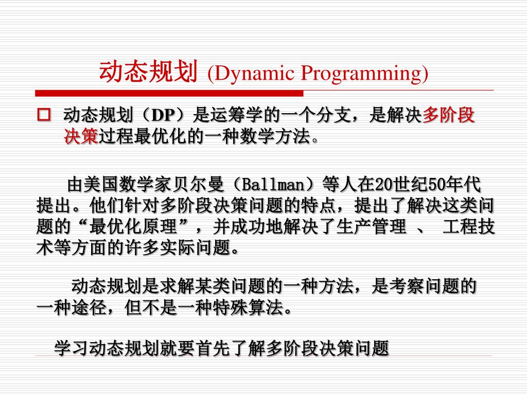 动态规划 (Dynamic Programming) • 动态规划(DP)是运筹学的一个分支,是解决多阶段决策过程最优化的一种数学方法。 由美国数学家贝尔曼(Ballman)等人在20世纪50年代提出。他们针对多阶段决策问题的特点,提出了解决这类问题的“最优化原理”,并成功地解决了生产管理 、 工程技术等方面的许多实际问题。 动态规划是求解某类问题的一种方法,是考察问题的一种途径,但不是一种特殊算法。 学习动态规划就要首先了解多阶段决策问题