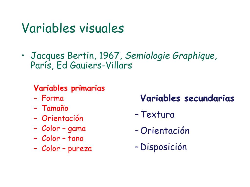 Variables visuales • Jacques Bertin, 1967, SemiologieGraphique, París, Ed Gauiers-Villars Variables primarias • Forma • Tamaño • Orientación • Color – gama • Color – tono • Color – pureza • Variables secundarias • Textura • Orientación • Disposición
