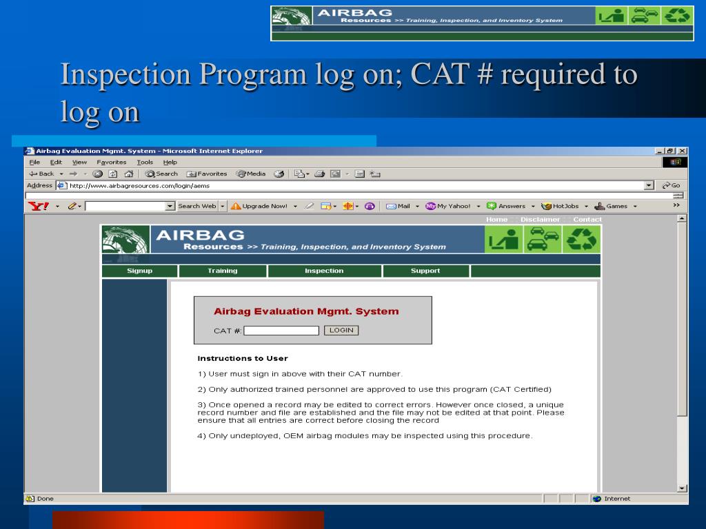 Airbag Resources/Training of Techs • Technicians must be trained and certified before extracting, handling, inspecting or shipping airbags • Tech take a test through Airbag Resources which grades their performance. Once acceptable level is reached employee is a Certified Airbag Technician (CAT) • Non certified personnel not allowed to work with airbags