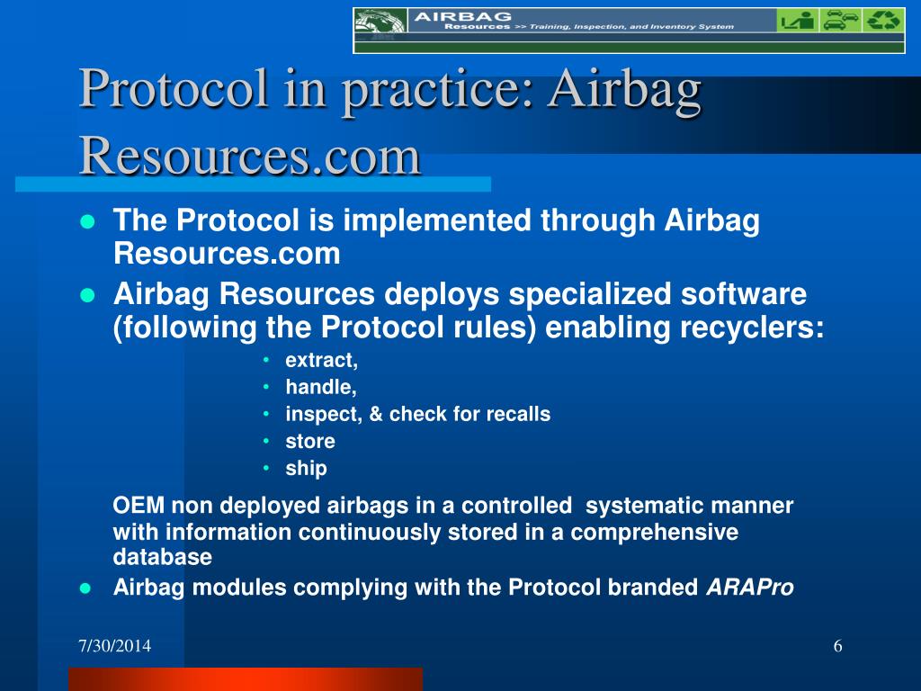 Protocol in practice: Airbag Resources.com • The Protocol is implemented through Airbag Resources.com • Airbag Resources deploys specialized software (following the Protocol rules) enabling recyclers: • extract, • handle, • inspect, & check for recalls • store • ship OEM non deployed airbags in a controlled systematic manner with information continuously stored in a comprehensive database • Airbag modules complying with the Protocol branded ARAPro