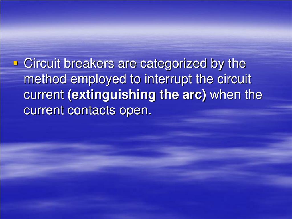 Circuit breakers are categorized by the method employed to interrupt the circuit current (extinguishing the arc) when the current contacts open.
