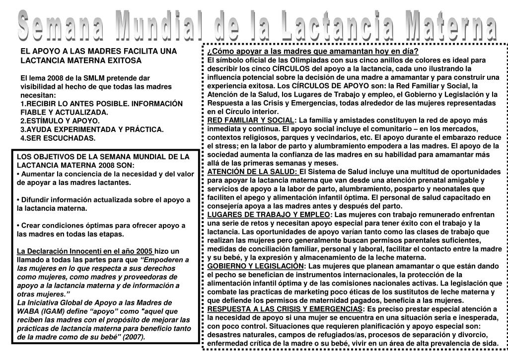 Semana Mundial de la Lactancia Materna EL APOYO A LAS MADRES FACILITA UNA LACTANCIA MATERNA EXITOSA El lema 2008 de la SMLM pretende dar visibilidad al hecho de que todas las madres necesitan: RECIBIR LO ANTES POSIBLE. INFORMACIÓN FIABLE Y ACTUALIZADA. ESTÍMULO Y APOYO. AYUDA EXPERIMENTADA Y PRÁCTICA. SER ESCUCHADAS. ¿Cómo apoyar a las madres que amamantan hoy en día? El símbolo oficial de las Olimpiadas con sus cinco anillos de colores es ideal para describir los cinco CÍRCULOS del apoyo a la lactancia, cada uno ilustrando la influencia potencial sobre la decisión de una madre a amamantar y para construir una experiencia exitosa. Los CÍRCULOS DE APOYO son: la Red Familiar y Social, la Atención de la Salud, los Lugares de Trabajo y empleo, el Gobierno y Legislación y la Respuesta a las Crisis y Emergencias, todas alrededor de las mujeres representadas en el Círculo interior. RED FAMILIAR Y SOCIAL: La familia y amistades constituyen la red de apoyo más inmediata y continua. El apoyo social incluye el comunitario – en los mercados, contextos religiosos, parques y vecindarios, etc. El apoyo durante el embarazo reduce el stress; en la labor de parto y alumbramiento empodera a las madres. El apoyo de la sociedad aumenta la confianza de las madres en su habilidad para amamantar más allá de las primeras semanas y meses. ATENCIÓN DE LA SALUD: El Sistema de Salud incluye una multitud de oportunidades para apoyar la lactancia materna que van desde una atención prenatal amigable y servicios de apoyo a la labor de parto, alumbramiento, posparto y neonatales que faciliten el apego y alimentación infantil óptima. El personal de salud capacitado en consejería apoya a las madres antes y después del parto. LUGARES DE TRABAJO Y EMPLEO: Las mujeres con trabajo remunerado enfrentan una serie de retos y necesitan apoyo especial para tener éxito con el trabajo y la lactancia. Las oportunidades de apoyo varían tanto como las clases de trabajo que realizan las mujeres pero generalmente buscan permisos parentales suficientes, medidas de conciliación familiar, personal y laboral, facilitar el contacto entre la madre y su bebé, y la expresión y almacenamiento de la leche materna. GOBIERNO Y LEGISLACIÓN: Las mujeres que planean amamantar o que están dando el pecho se benefician de instrumentos internacionales, la protección de la alimentación infantil óptima y de las comisiones nacionales activas. La legislación que combate las practicas de marketing poco éticas de los sustitutos de leche materna y que defiende los permisos de maternidad pagados, beneficia a las mujeres.RESPUESTA A LAS CRISIS Y EMERGENCIAS: Es preciso prestar especial atención a la necesidad de apoyo si una mujer se encuentra en una situación seria e inesperada, con poco control. Situaciones que requieren planificación y apoyo especial son: desastres naturales, campos de refugiados/as, procesos de separación y divorcio, enfermedad crítica de la madre o su bebé, vivir en un área de alta prevalencia de sida. LOS OBJETIVOS DE LA SEMANA MUNDIAL DE LA LACTANCIA MATERNA 2008 SON:• Aumentar la conciencia de la necesidad y del valor de apoyar a las madres lactantes. • Difundir información actualizada sobre el apoyo a la lactancia materna. • Crear condiciones óptimas para ofrecer apoyo a las madres en todas las etapas. La Declaración Innocenti en el año 2005 hizo un llamado a todas las partes para que “Empoderen a las mujeres en lo que respecta a sus derechos como mujeres, como madres y proveedoras de apoyo a la lactancia materna y de información a otras mujeres.”La Iniciativa Global de Apoyo a las Madres de WABA (IGAM) define “apoyo” como "aquel que reciben las madres con el propósito de mejorar las prácticas de lactancia materna para beneficio tanto de la madre como de su bebé" (2007). .