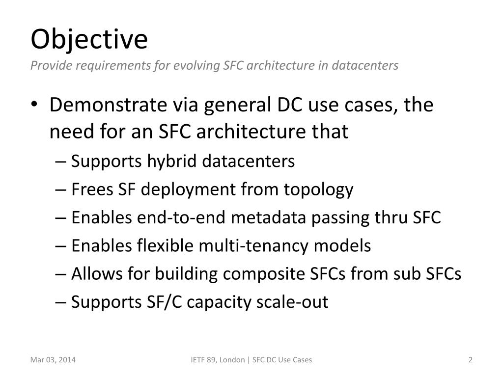 ObjectiveProvide requirements for evolving SFC architecture in datacenters • Demonstrate via general DC use cases, the need for an SFC architecture that • Supports hybrid datacenters • Frees SF deployment from topology • Enables end-to-end metadata passing thru SFC • Enables flexible multi-tenancy models • Allows for building composite SFCs from sub SFCs • Supports SF/C capacity scale-out IETF 89, London | SFC DC Use Cases
