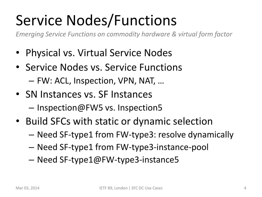 Service Nodes/FunctionsEmerging Service Functions on commodity hardware & virtual form factor • Physical vs. Virtual Service Nodes • Service Nodes vs. Service Functions • FW: ACL, Inspection, VPN, NAT, … • SN Instances vs. SF Instances • Inspection@FW5 vs. Inspection5 • Build SFCs with static or dynamic selection • Need SF-type1 from FW-type3: resolve dynamically • Need SF-type1 from FW-type3-instance-pool • Need SF-type1@FW-type3-instance5 IETF 89, London | SFC DC Use Cases