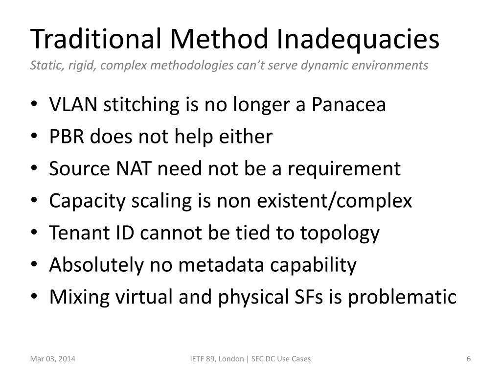 Traditional Method InadequaciesStatic, rigid, complex methodologies can’t serve dynamic environments • VLAN stitching is no longer a Panacea • PBR does not help either • Source NAT need not be a requirement • Capacity scaling is non existent/complex • Tenant ID cannot be tied to topology • Absolutely no metadata capability • Mixing virtual and physical SFs is problematic IETF 89, London | SFC DC Use Cases