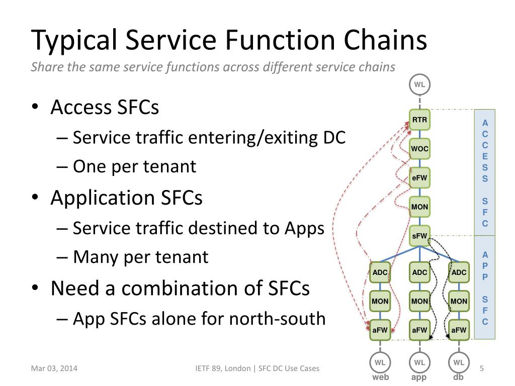 Typical Service Function ChainsShare the same service functions across different service chains WL • Access SFCs • Service traffic entering/exiting DC • One per tenant • Application SFCs • Service traffic destined to Apps • Many per tenant • Need a combination of SFCs • App SFCs alone for north-south ACCESS SFC RTR WOC eFW MON sFW APP SFC ADC ADC ADC MON MON MON aFW aFW aFW WL WL WL IETF 89, London | SFC DC Use Cases web app db