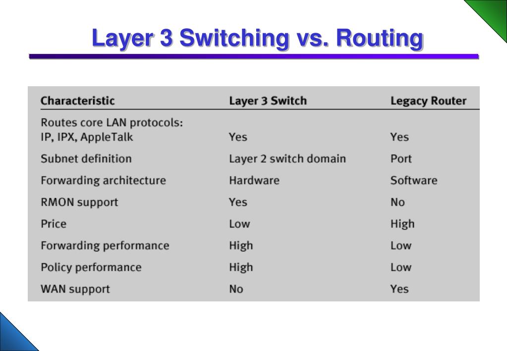 등장 배경 • Layer 3 Switching 등장 배경 • Layer 2 Switching과 Layer 3 Routing 기능의 통합 • 각각의 LAN segment 연결을 위해 Router 도입 • Router는 소프트웨어 기반의 Routing의 속도 향상 필요 • Switching과 Routing 기능의 통합으로 인한 비용 효율성 증대 • 기술적 배경 • ASIC (Application Specific Integrated Circuit) 기술 발달 • Hardware 기반의 고속 라우팅 기능 지원 가능 • 고성능의 Switching Fabric 지원 • 많은 사용자 포트를 지원하는 고성능, 대용량의 스위치 장비 개발 가능 • CPU/Memory 기술 발달 • Layer 2 Switch에 비해 늘어나는 프로세싱 부하에 대한 원활한 처리 가능