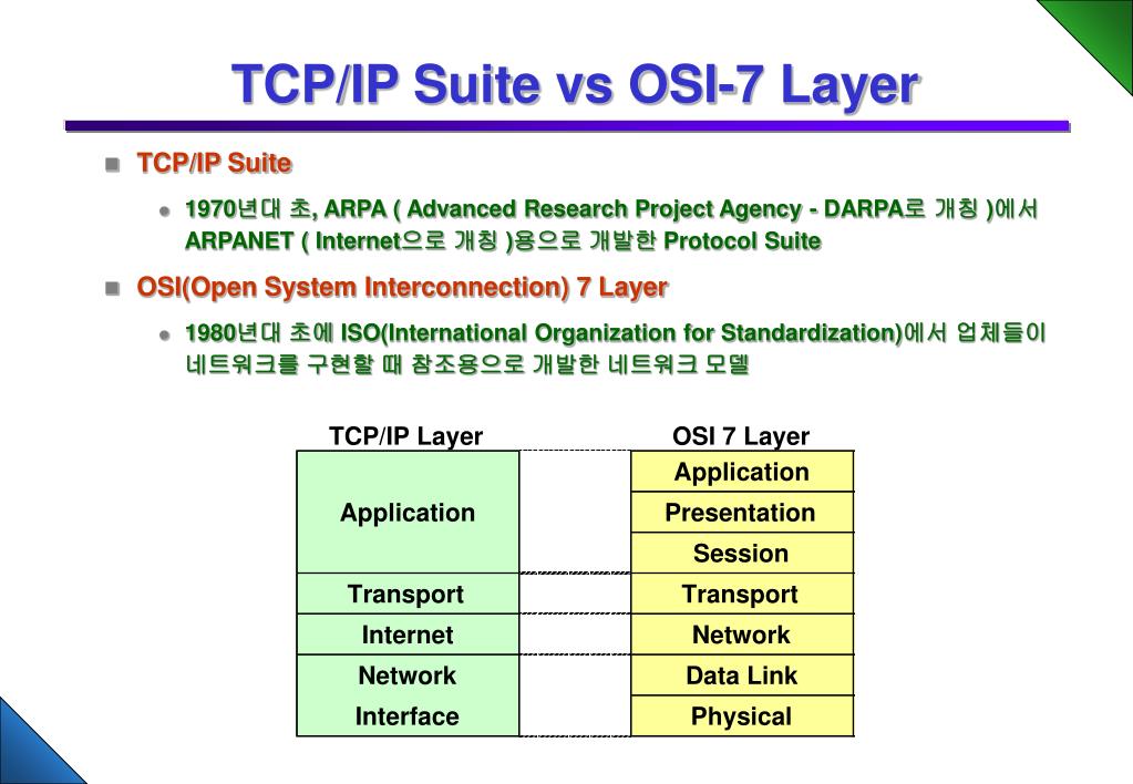 TCP/IP Suite vs OSI-7 Layer • TCP/IP Suite • 1970년대 초, ARPA ( Advanced Research Project Agency - DARPA로 개칭 )에서 ARPANET ( Internet으로 개칭 )용으로 개발한 Protocol Suite • OSI(Open System Interconnection) 7 Layer • 1980년대 초에 ISO(International Organization for Standardization)에서 업체들이 네트워크를 구현할 때 참조용으로 개발한 네트워크 모델