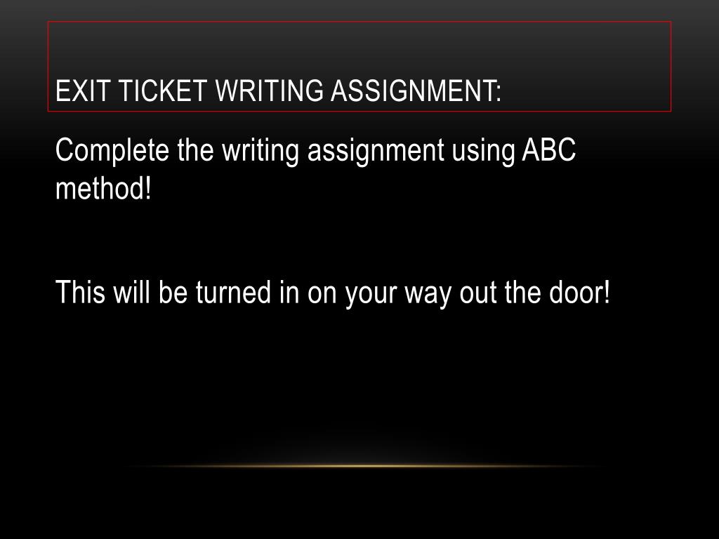 Exit Ticket Writing Assignment: Complete the writing assignment using ABC method! This will be turned in on your way out the door!