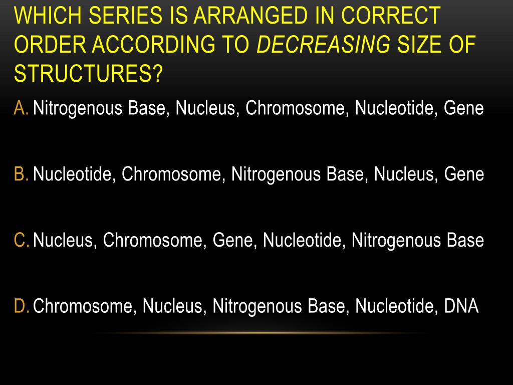 Which series is arranged in correct order according to decreasing size of structures? • Nitrogenous Base, Nucleus, Chromosome, Nucleotide, Gene • Nucleotide, Chromosome, Nitrogenous Base, Nucleus, Gene • Nucleus, Chromosome, Gene, Nucleotide, Nitrogenous Base • Chromosome, Nucleus, Nitrogenous Base, Nucleotide, DNA