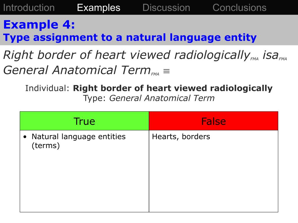 Introduction Examples DiscussionConclusions Example 4:Type assignment to a natural language entity Right border of heart viewed radiologicallyFMA isaFMA General Anatomical TermFMA Individual:Right border of heart viewed radiologically Type: General Anatomical Term True False • Natural language entities (terms) Hearts, borders