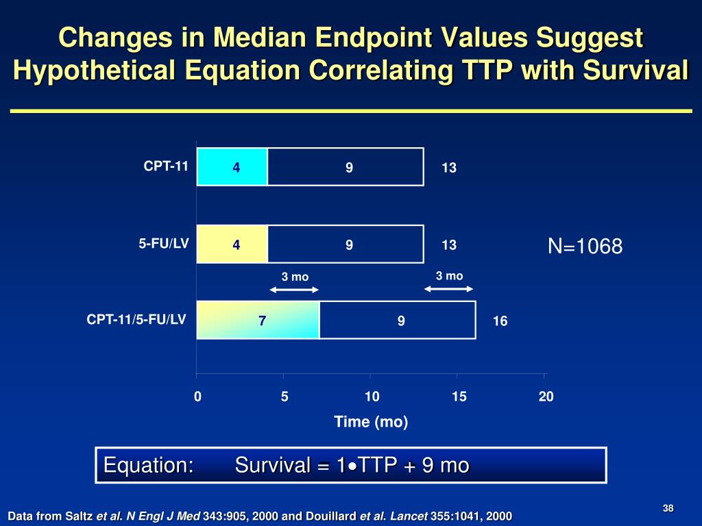 Changes in Median Endpoint Values Suggest Hypothetical Equation Correlating TTP with Survival 13 CPT-11 4 9 N=1068 13 5-FU/LV 4 9 3 mo 3 mo 16 CPT-11/5-FU/LV 7 9 0 5 10 15 20 Time (mo) Equation: Survival = 1TTP + 9 mo Data from Saltz et al. N Engl J Med 343:905, 2000 and Douillard et al. Lancet 355:1041, 2000