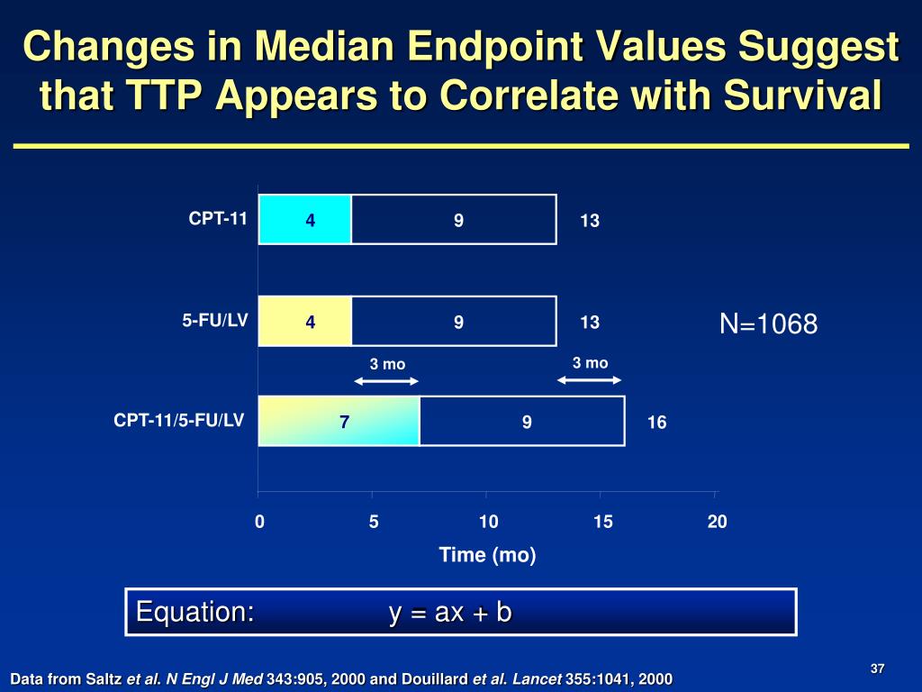 Changes in Median Endpoint Values Suggest that TTP Appears to Correlate with Survival 3 mo 3 mo 13 CPT-11 4 9 N=1068 13 5-FU/LV 4 9 16 CPT-11/5-FU/LV 7 9 0 5 10 15 20 Time (mo) Equation: y = ax + b Data from Saltz et al. N Engl J Med 343:905, 2000 and Douillard et al. Lancet 355:1041, 2000