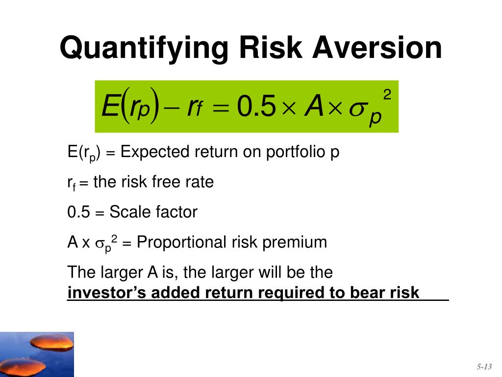 Quantifying Risk Aversion E(rp) = Expected return on portfolio p rf = the risk free rate 0.5 = Scale factor A x p2 = Proportional risk premium The larger A is, the larger will be the _________________________________________ investor’s added return required to bear risk 5-13