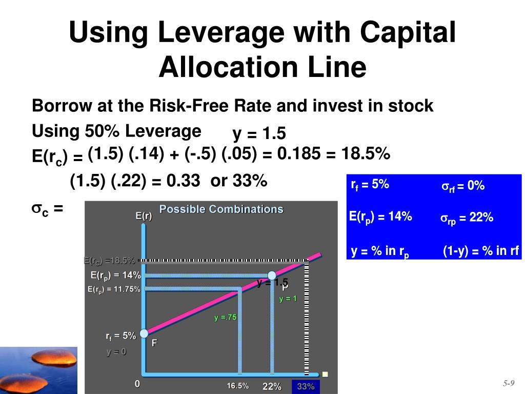 Combinations Without Leverage E(rc) = yE(rp) + (1 - y)rf y = .75 E(rc) = y = 1 E(rc) = y = 0 E(rc) = (.75)(.14) + (.25)(.05) = 11.75% 75(.22) = 16.5% (1)(.14) + (0)(.05) = 14.00% 1(.22) = 22% 0(.22) = 0% (0)(.14) + (1)(.05) = 5.00% Since σrf = 0 σc= y σp If y = .75, then σc= If y = 1 σc= If y = 0 σc= 5-8