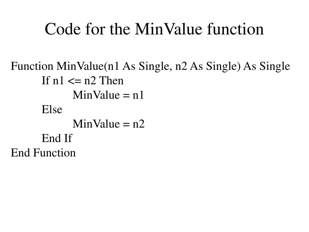 Code for the MinValue function Function MinValue(n1 As Single, n2 As Single) As Single If n1 <= n2 Then MinValue = n1 Else MinValue = n2 End If End Function