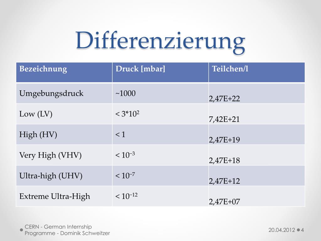 „Vakuum heißt der Zustand eines Gases, wenn in einem Behälter der Druck des Gases und damit die Teilchenzahldichte niedriger ist als außerhalb oder wenn der Druck des Gases niedriger ist als 300 mbar, d. h. kleiner als der niedrigste auf der Erdoberfläche vorkommende Atmosphärendruck“ – DIN 28400 CERN - German Internship Programme - Dominik Schweitzer
