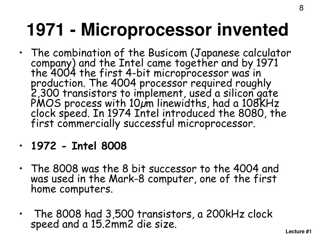8 1971 - Microprocessor invented • The combination of the Busicom (Japanese calculator company) and the Intel came together and by 1971 the 4004 the first 4-bit microprocessor was in production. The 4004 processor required roughly 2,300 transistors to implement, used a silicon gate PMOS process with 10µm linewidths, had a 108KHz clock speed. In 1974 Intel introduced the 8080, the first commercially successful microprocessor. • 1972 - Intel 8008 • The 8008 was the 8 bit successor to the 4004 and was used in the Mark-8 computer, one of the first home computers. • The 8008 had 3,500 transistors, a 200kHz clock speed and a 15.2mm2 die size. Lecture #1