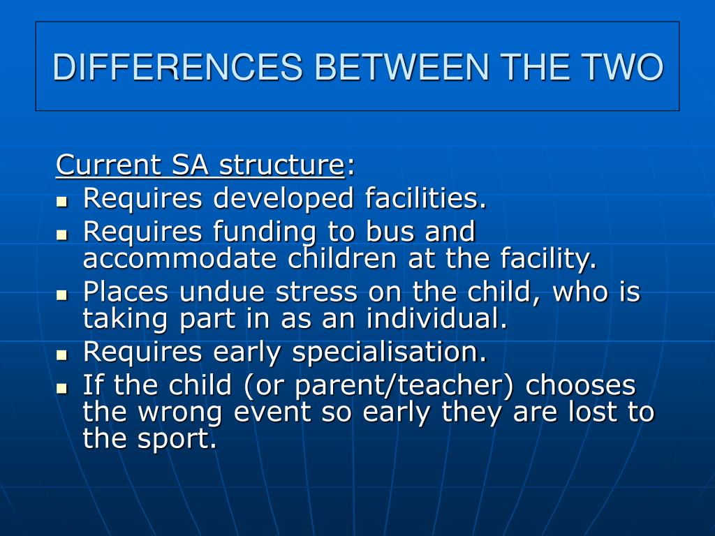 DIFFERENCES BETWEEN THE TWO Current SA structure: • Requires developed facilities. • Requires funding to bus and accommodate children at the facility. • Places undue stress on the child, who is taking part in as an individual. • Requires early specialisation. • If the child (or parent/teacher) chooses the wrong event so early they are lost to the sport.