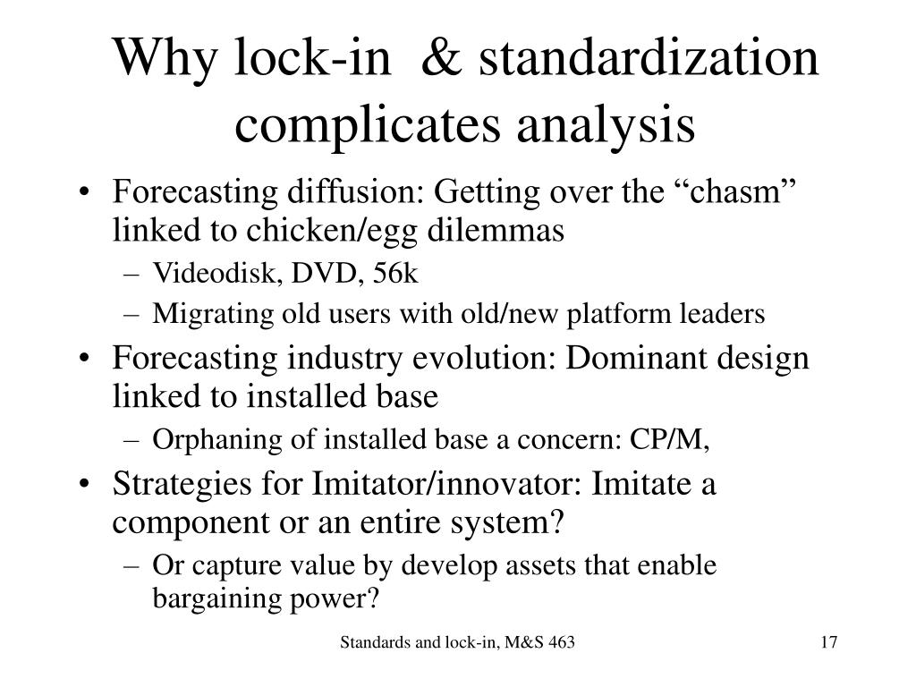 Why lock-in & standardization complicates analysis • Forecasting diffusion: Getting over the “chasm” linked to chicken/egg dilemmas • Videodisk, DVD, 56k • Migrating old users with old/new platform leaders • Forecasting industry evolution: Dominant design linked to installed base • Orphaning of installed base a concern: CP/M, • Strategies for Imitator/innovator: Imitate a component or an entire system? • Or capture value by develop assets that enable bargaining power? Standards and lock-in, M&S 463