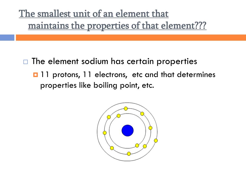 The smallest unit of an element that maintains the properties of that element??? • The element sodium has certain properties • 11 protons, 11 electrons, etc and that determines properties like boiling point, etc.