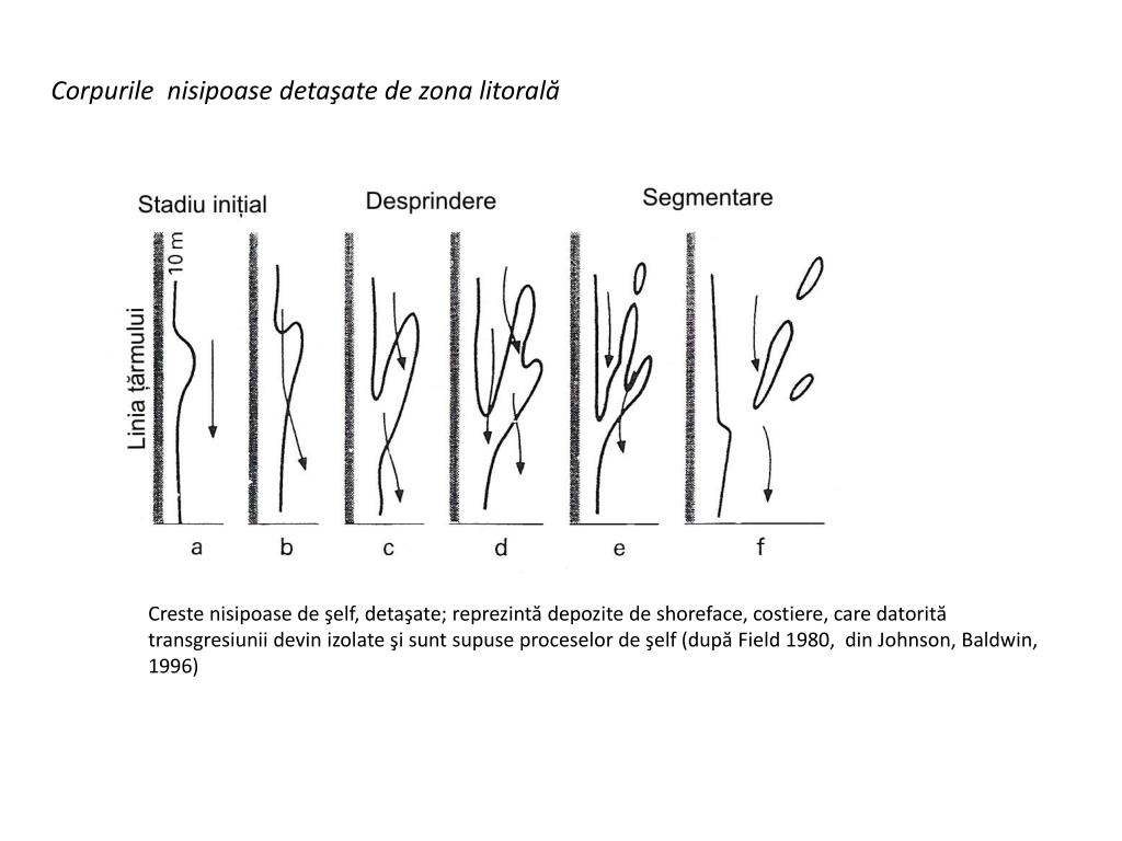 Corpurile nisipoase detaşate de zona litorală Creste nisipoase de şelf, detaşate; reprezintă depozite de shoreface, costiere, care datorită transgresiunii devin izolate şi sunt supuse proceselor de şelf (după Field 1980, din Johnson, Baldwin, 1996)