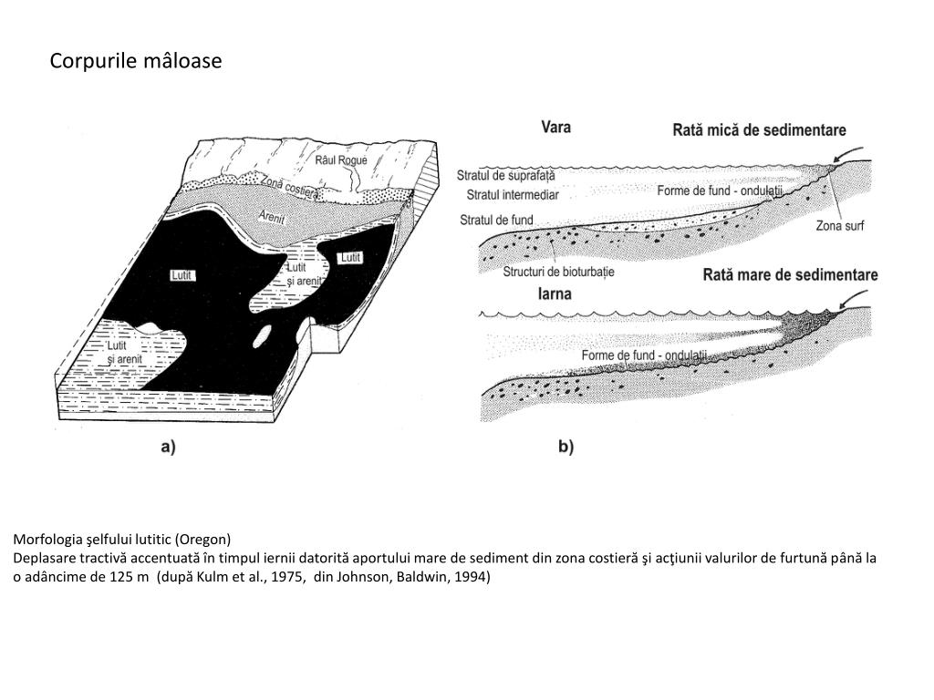 Corpurile mâloase Morfologia şelfului lutitic (Oregon) Deplasare tractivă accentuată în timpul iernii datorită aportului mare de sediment din zona costieră şi acţiunii valurilor de furtună până la o adâncime de 125 m (după Kulm et al., 1975, din Johnson, Baldwin, 1994)