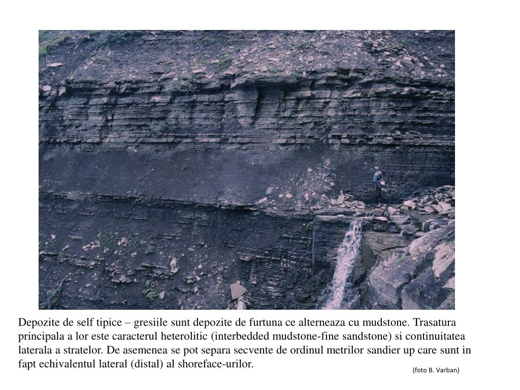Depozite de self tipice – gresiilesuntdepozite de furtunacealterneaza cu mudstone. Trasaturaprincipala a lorestecaracterulheterolitic (interbedded mudstone-fine sandstone) sicontinuitatealaterala a stratelor. De asemenea se pot separasecvente de ordinulmetrilor sandier up care sunt in faptechivalentul lateral (distal) al shoreface-urilor. (foto B. Varban)