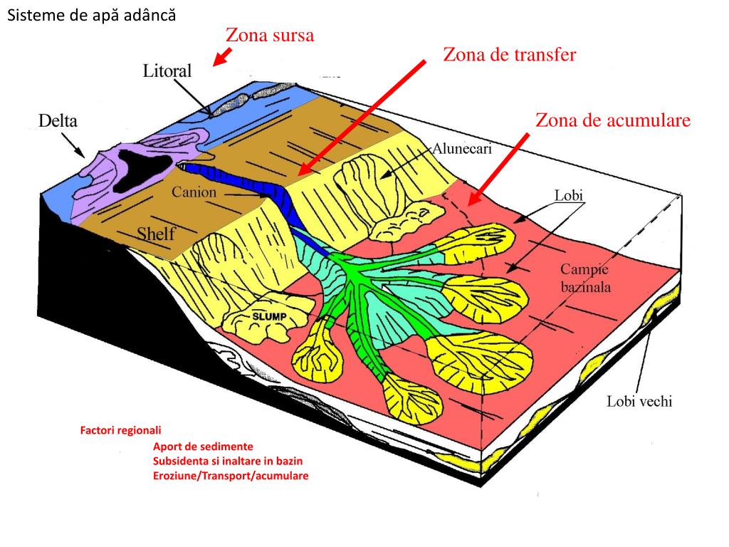 Sisteme de apă adâncă Zona sursa Zona de transfer Zona de acumulare Factori regionali Aport de sedimente Subsidenta si inaltare in bazin Eroziune/Transport/acumulare