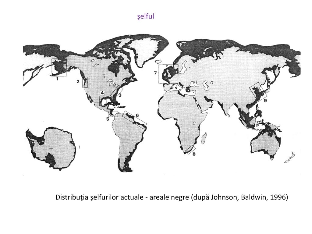 şelful Distribuţia şelfurilor actuale - areale negre (după Johnson, Baldwin, 1996)