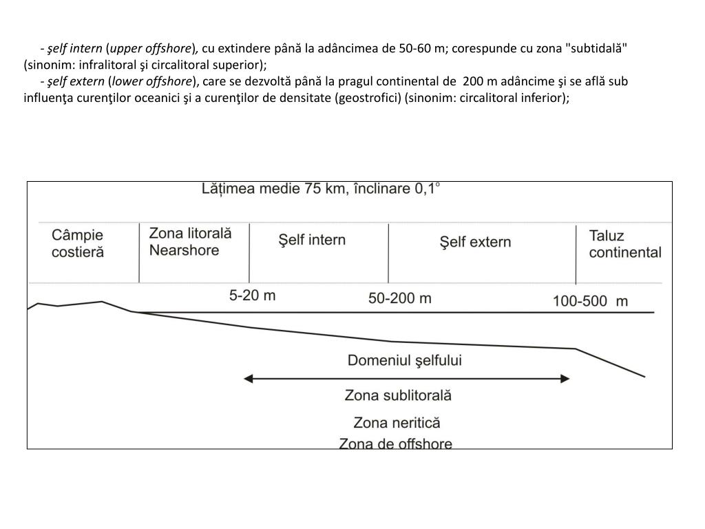 - şelf intern (upper offshore), cu extindere până la adâncimea de 50-60 m; corespunde cu zona "subtidală" (sinonim: infralitoral şi circalitoral superior); - şelf extern (lower offshore),carese dezvoltă până la pragul continental de 200 m adâncime şi se află sub influenţa curenţilor oceanici şi a curenţilor de densitate (geostrofici) (sinonim: circalitoral inferior);