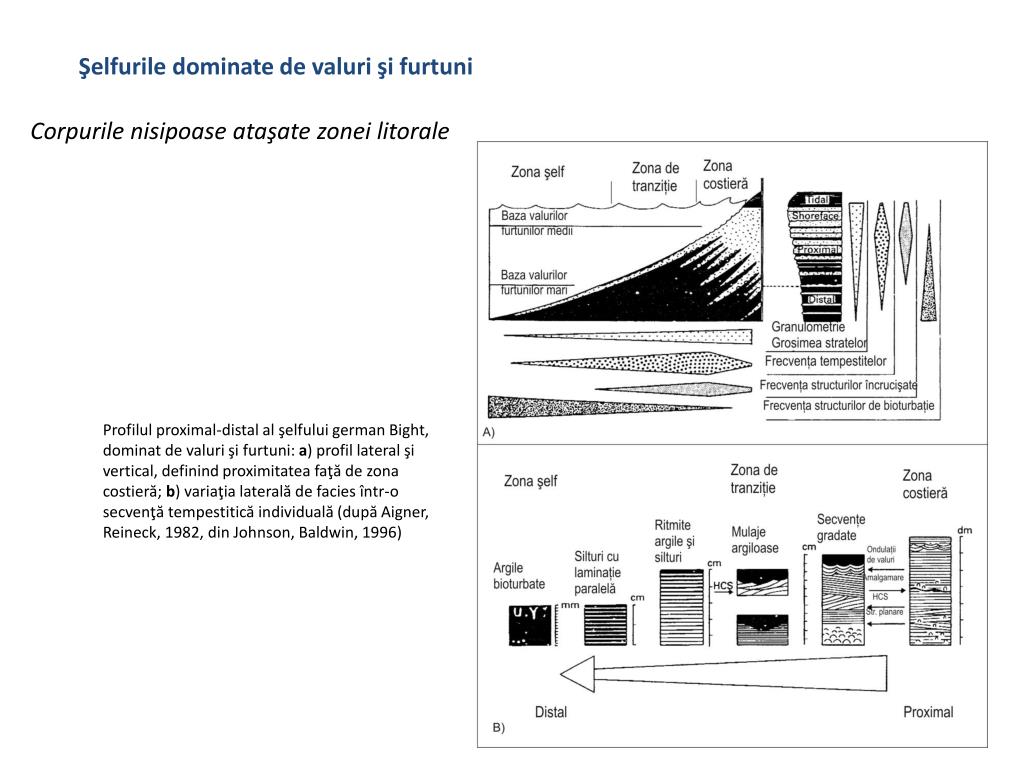 Şelfurile dominate de valuri şi furtuni Corpurile nisipoase ataşate zonei litorale Profilul proximal-distal al şelfului german Bight, dominat de valuri şi furtuni: a) profil lateral şi vertical, definind proximitatea faţă de zona costieră; b) variaţia laterală de facies într-o secvenţă tempestitică individuală (după Aigner, Reineck, 1982, din Johnson, Baldwin, 1996)