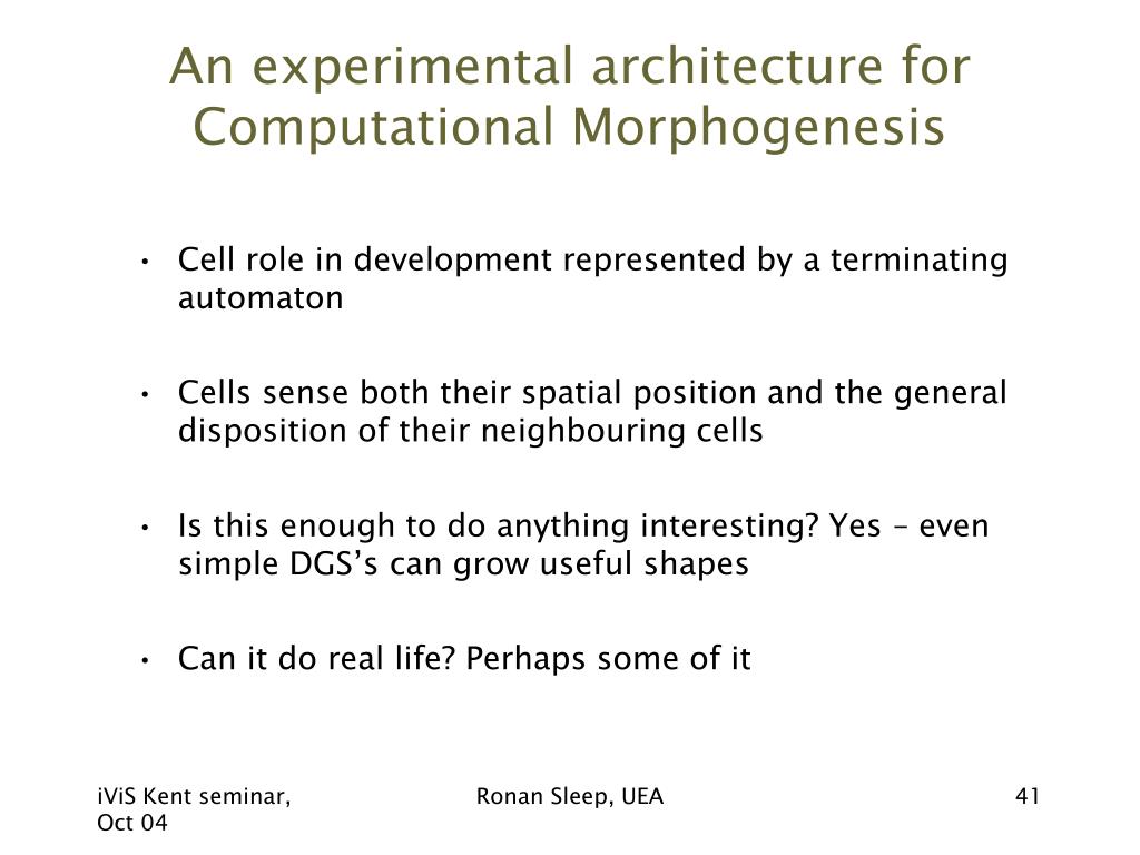 An experimental architecture for Computational Morphogenesis • Cell role in development represented by a terminating automaton • Cells sense both their spatial position and the general disposition of their neighbouring cells • Is this enough to do anything interesting? Yes – even simple DGS’s can grow useful shapes • Can it do real life? Perhaps some of it Ronan Sleep, UEA