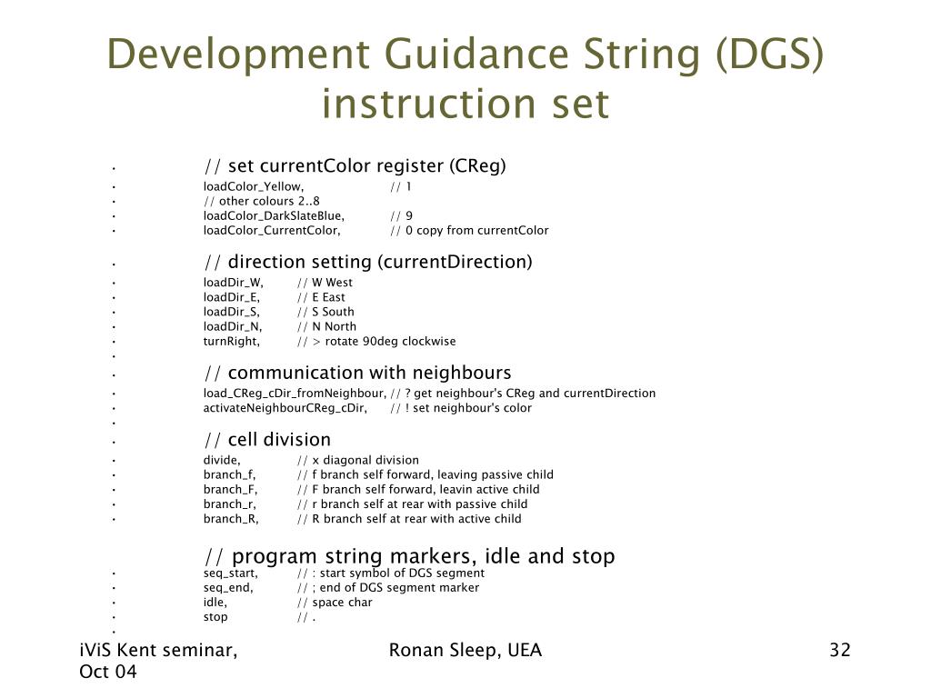 Development Guidance String (DGS) instruction set • // set currentColor register (CReg) • loadColor_Yellow, // 1 • // other colours 2..8 • loadColor_DarkSlateBlue, // 9 • loadColor_CurrentColor, // 0 copy from currentColor • // direction setting (currentDirection) • loadDir_W, // W West • loadDir_E, // E East • loadDir_S, // S South • loadDir_N, // N North • turnRight, // > rotate 90deg clockwise • // communication with neighbours • load_CReg_cDir_fromNeighbour, // ? get neighbour's CReg and currentDirection • activateNeighbourCReg_cDir, // ! set neighbour's color • // cell division • divide, // x diagonal division • branch_f, // f branch self forward, leaving passive child • branch_F, // F branch self forward, leavin active child • branch_r, // r branch self at rear with passive child • branch_R, // R branch self at rear with active child // program string markers, idle and stop • seq_start, // : start symbol of DGS segment • seq_end, // ; end of DGS segment marker • idle, // space char • stop // . Ronan Sleep, UEA