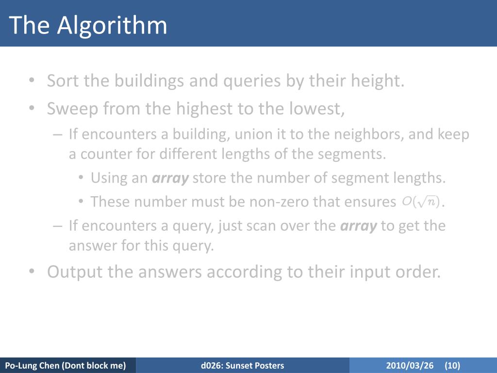 The Algorithm • Sort the buildings and queries by their height. • Sweep from the highest to the lowest, • If encounters a building, union it to the neighbors, and keep a counter for different lengths of the segments. • Using an array store the number of segment lengths. • These number must be non-zero that ensures . • If encounters a query, just scan over the array to get the answer for this query. • Output the answers according to their input order.