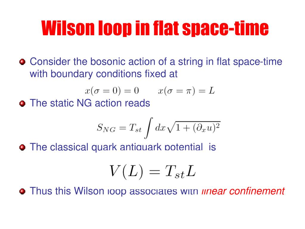 Wilson loop in flat space-time • Consider the bosonic action of a string in flat space-time with boundary conditions fixed at • The static NG action reads • The classical quark antiquark potential is • Thus this Wilson loop associates with linear confinement