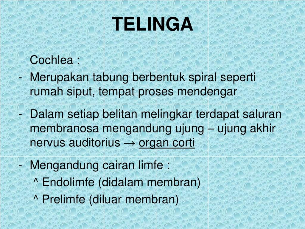 TELINGA Cochlea : • Merupakan tabung berbentuk spiral seperti rumah siput, tempat proses mendengar • Dalam setiap belitan melingkar terdapat saluran membranosa mengandung ujung – ujung akhir nervus auditorius → organ corti • Mengandung cairan limfe : ^ Endolimfe (didalam membran) ^ Prelimfe (diluar membran)