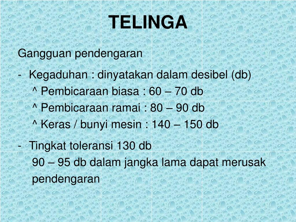 TELINGA Gangguan pendengaran • Kegaduhan : dinyatakan dalam desibel (db) ^ Pembicaraan biasa : 60 – 70 db ^ Pembicaraan ramai : 80 – 90 db ^ Keras / bunyi mesin : 140 – 150 db • Tingkat toleransi 130 db 90 – 95 db dalam jangka lama dapat merusak pendengaran