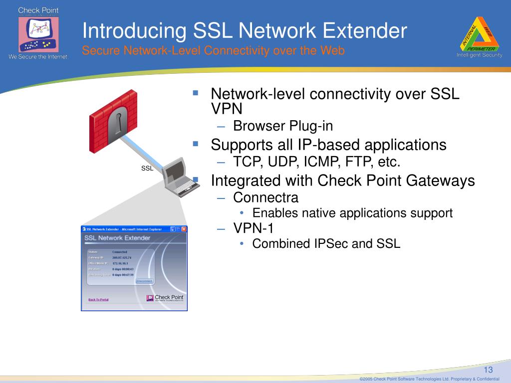 Introducing SSL Network ExtenderSecure Network-Level Connectivity over the Web • Network-level connectivity over SSL VPN • Browser Plug-in • Supports all IP-based applications • TCP, UDP, ICMP, FTP, etc. • Integrated with Check Point Gateways • Connectra • Enables native applications support • VPN-1 • Combined IPSec and SSL SSL