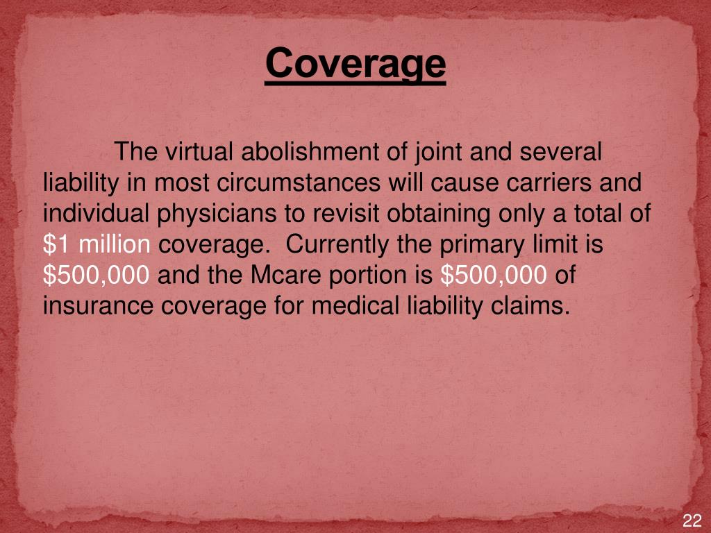 Coverage The virtual abolishment of joint and several liability in most circumstances will cause carriers and individual physicians to revisit obtaining only a total of $1 million coverage. Currently the primary limit is $500,000 and the Mcare portion is $500,000 of insurance coverage for medical liability claims. 22