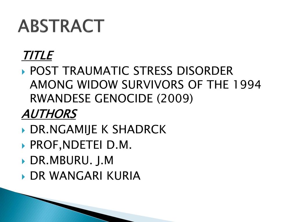 ABSTRACT TITLE • POST TRAUMATIC STRESS DISORDER AMONG WIDOW SURVIVORS OF THE 1994 RWANDESE GENOCIDE (2009) AUTHORS • DR.NGAMIJE K SHADRCK • PROF,NDETEI D.M. • DR.MBURU. J.M • DR WANGARI KURIA