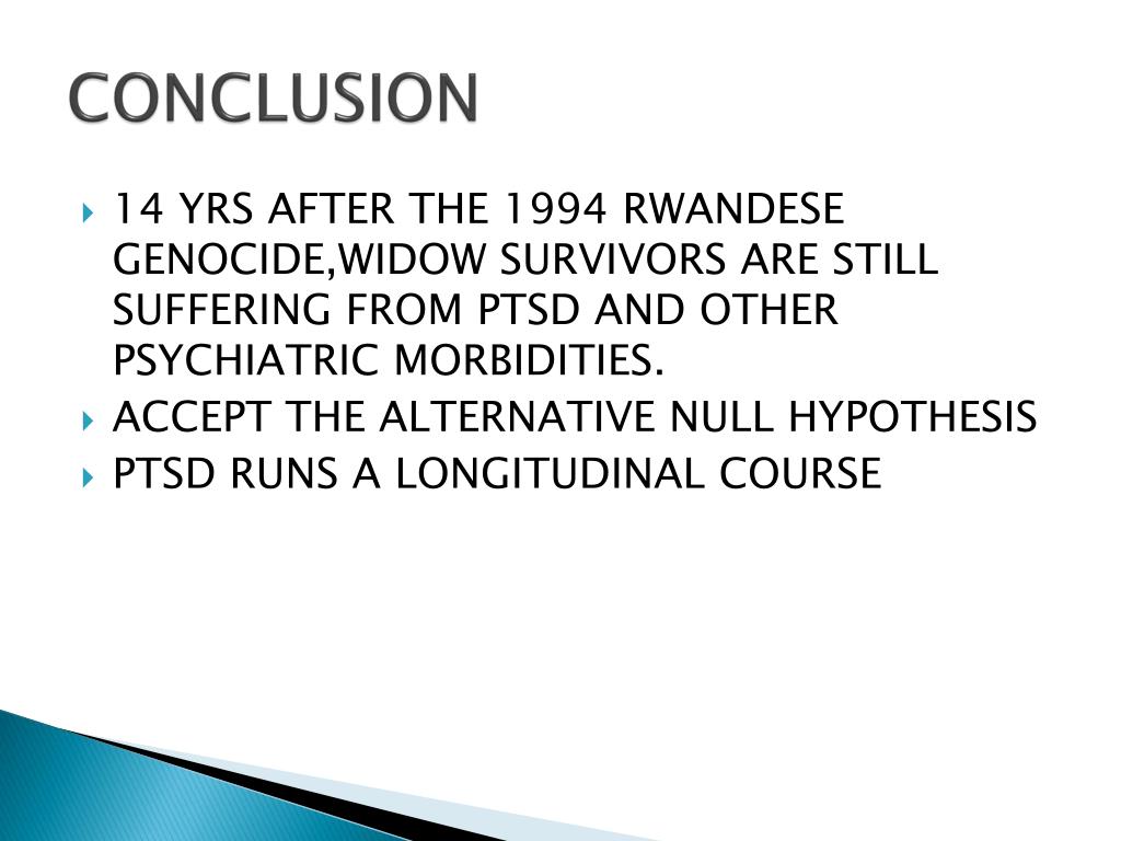 CONCLUSION • 14 YRS AFTER THE 1994 RWANDESE GENOCIDE,WIDOW SURVIVORS ARE STILL SUFFERING FROM PTSD AND OTHER PSYCHIATRIC MORBIDITIES. • ACCEPT THE ALTERNATIVE NULL HYPOTHESIS • PTSD RUNS A LONGITUDINAL COURSE