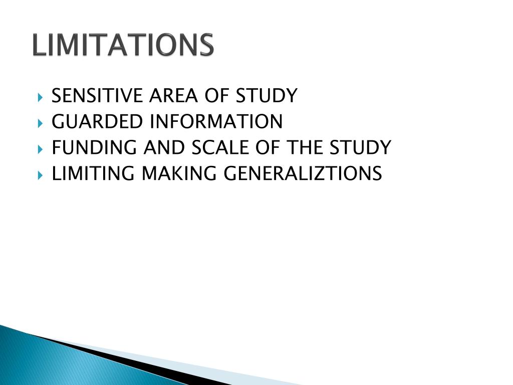 LIMITATIONS • SENSITIVE AREA OF STUDY • GUARDED INFORMATION • FUNDING AND SCALE OF THE STUDY • LIMITING MAKING GENERALIZTIONS