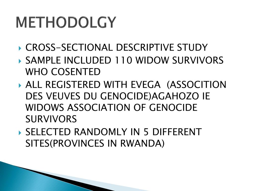 METHODOLGY • CROSS-SECTIONAL DESCRIPTIVE STUDY • SAMPLE INCLUDED 110 WIDOW SURVIVORS WHO COSENTED • ALL REGISTERED WITH EVEGA (ASSOCITION DES VEUVES DU GENOCIDE)AGAHOZO IE WIDOWS ASSOCIATION OF GENOCIDE SURVIVORS • SELECTED RANDOMLY IN 5 DIFFERENT SITES(PROVINCES IN RWANDA)