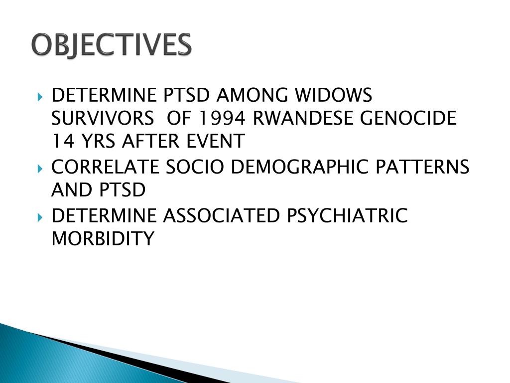 OBJECTIVES • DETERMINE PTSD AMONG WIDOWS SURVIVORS OF 1994 RWANDESE GENOCIDE 14 YRS AFTER EVENT • CORRELATE SOCIO DEMOGRAPHIC PATTERNS AND PTSD • DETERMINE ASSOCIATED PSYCHIATRIC MORBIDITY