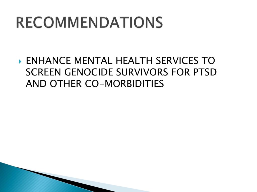 RECOMMENDATIONS • ENHANCE MENTAL HEALTH SERVICES TO SCREEN GENOCIDE SURVIVORS FOR PTSD AND OTHER CO-MORBIDITIES