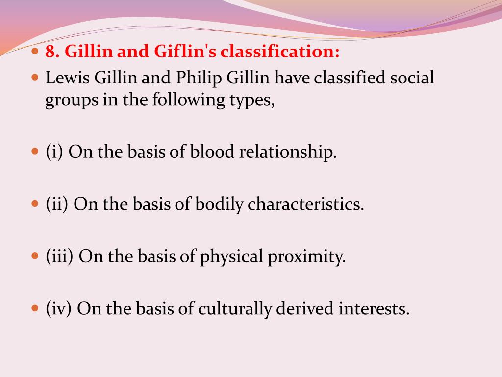 8. Gillin and Giflin's classification: • Lewis Gillin and Philip Gillin have classified social groups in the following types, • (i) On the basis of blood relationship. • (ii) On the basis of bodily characteristics. • (iii) On the basis of physical proximity. • (iv) On the basis of culturally derived interests.